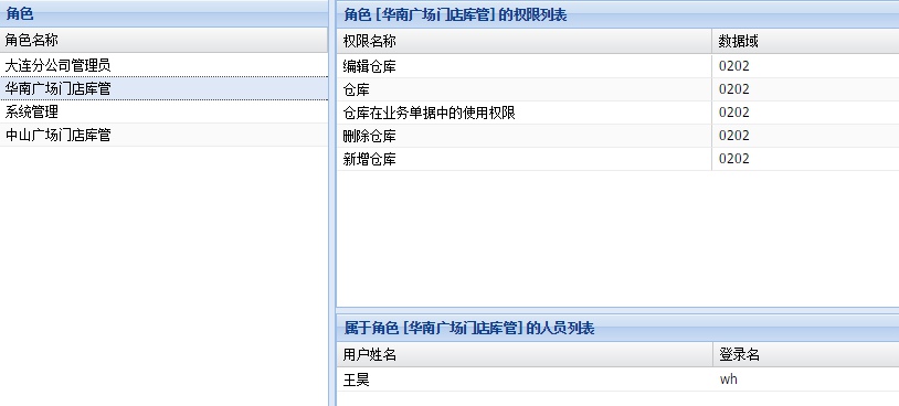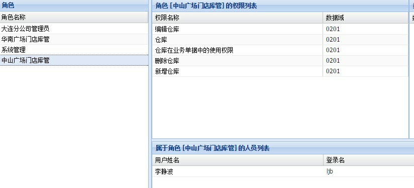 【中山广场门店库管】这个角色对应的用户是 ljb(李静波),其数据域是0201, 0201代表的是【大连分公司\中山广场门店】。