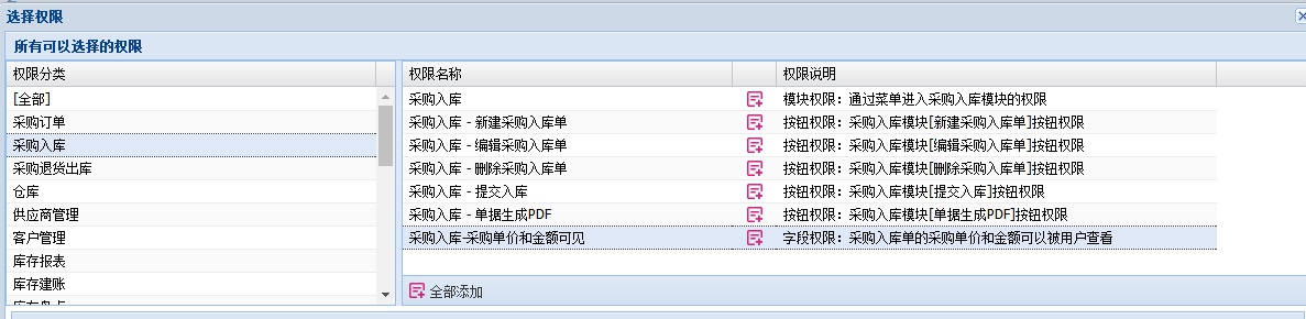 拥有该权限的用户,就可以正常查看入库单上的采购单价和金额。